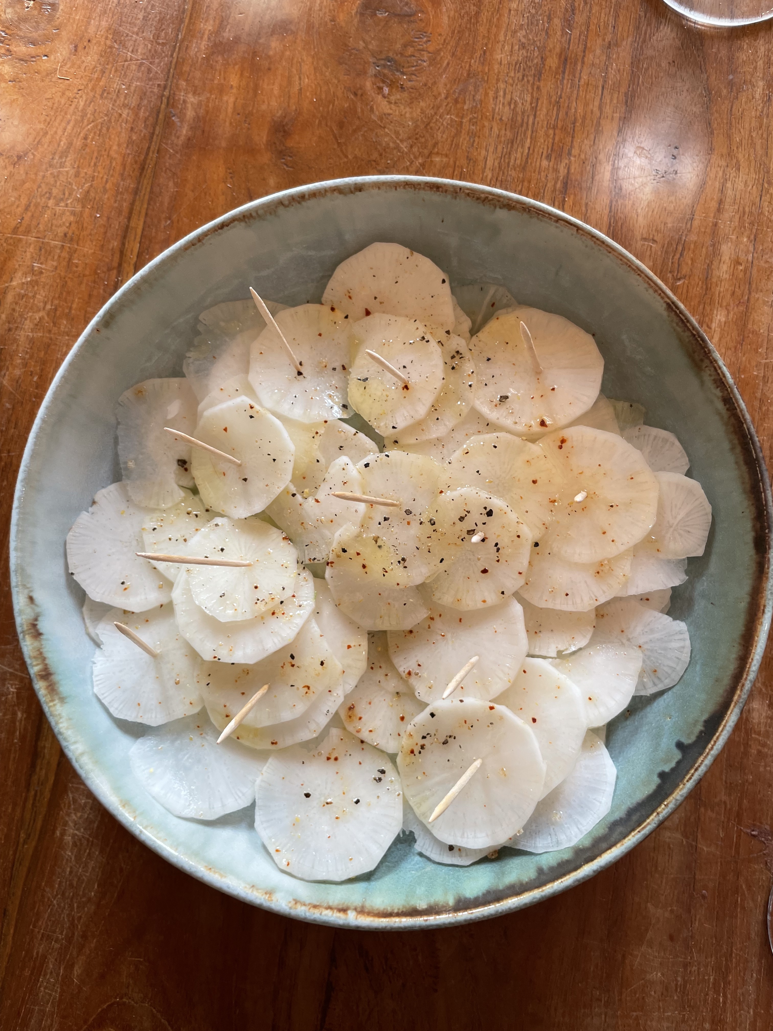 2. Disposer les lamelles dans votre assiette et saupoudrer de paprika et gros sel à votre convenance.